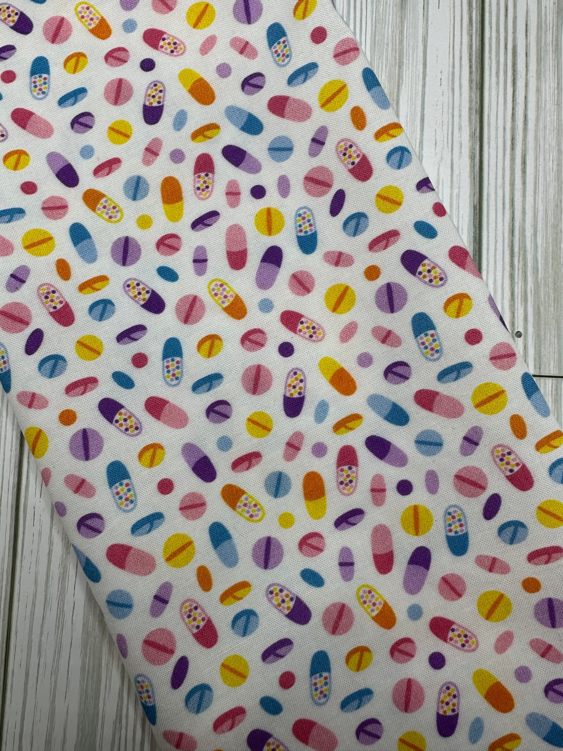 - Pharmacy is an appliqué font with medicine pills on fabric.